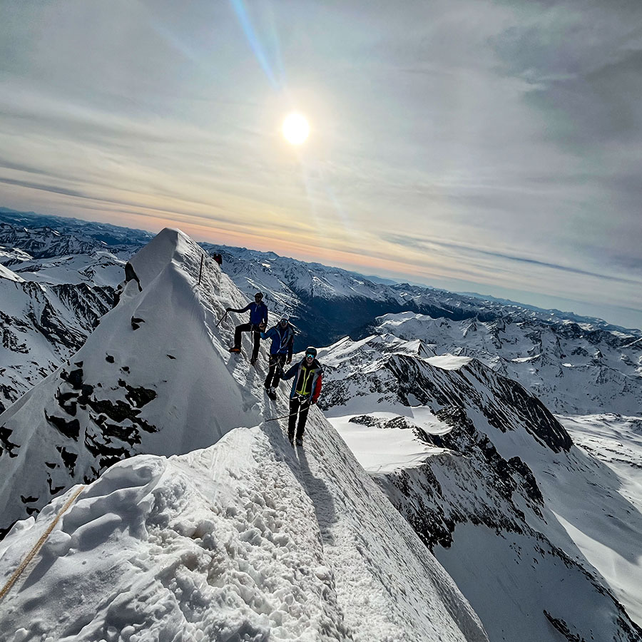 Wir treffen uns um 12:30 am Parkplatz beim Lucknerhaus. Nach dem Ausrüstungscheck steigen wir in ca. 3h zur Stüdelhütte auf, wo wir übernachten. Am nächsten Tag starten wir früh morgens über das Ködnitzkees bis kurz vor die Adlersruhe, wo wir die Ski deponieren. Anschließend geht es über das Glöcknerleitel und den schmalen Grat auf den Kleinglockner und von dort luftig weiter auf den höchsten Punkt von Österreich.